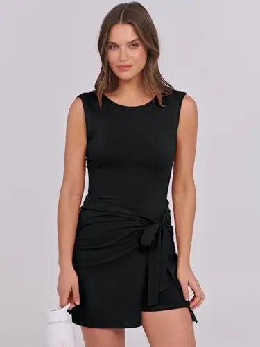 Summer Sleeveless Bodycon Dress Built-In Shorts Solid Romper Skort for Casual Night Vacation Wear Tie Cinched Natural Waist